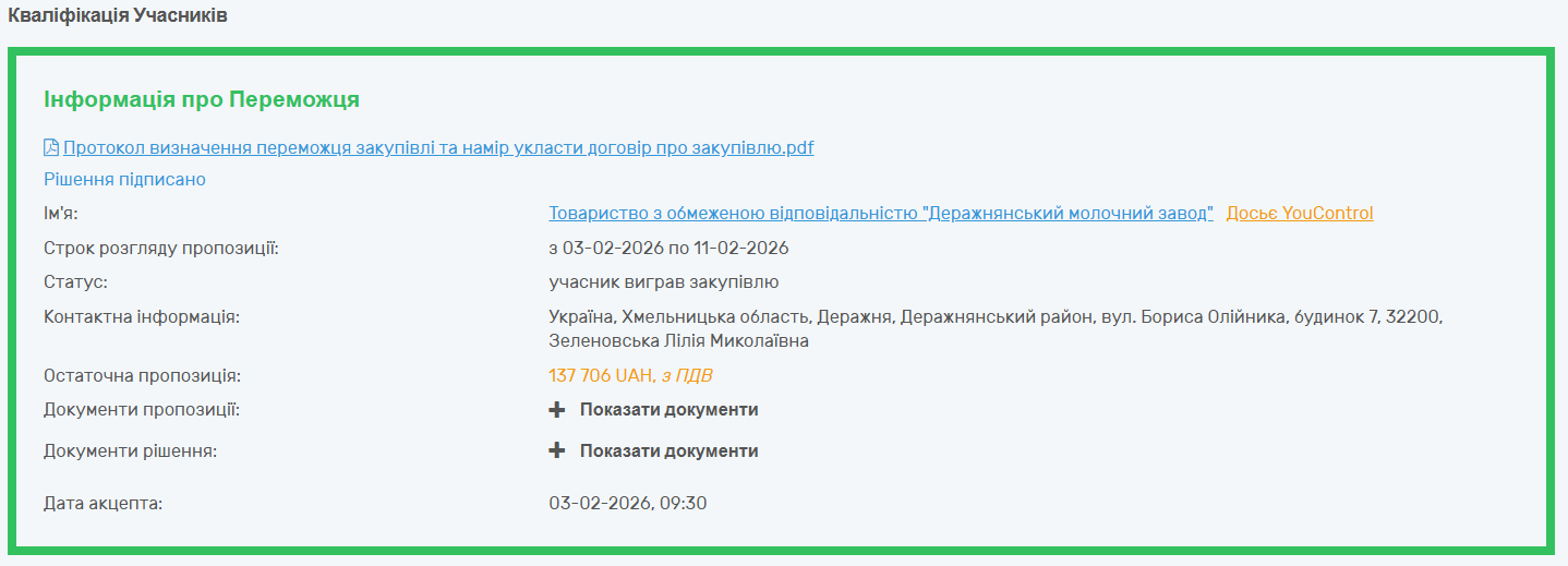 Переможець визначений і на виконання вимог Постанови № 822 автоматично сформувався електронний протокол розгляду пропозиції.
