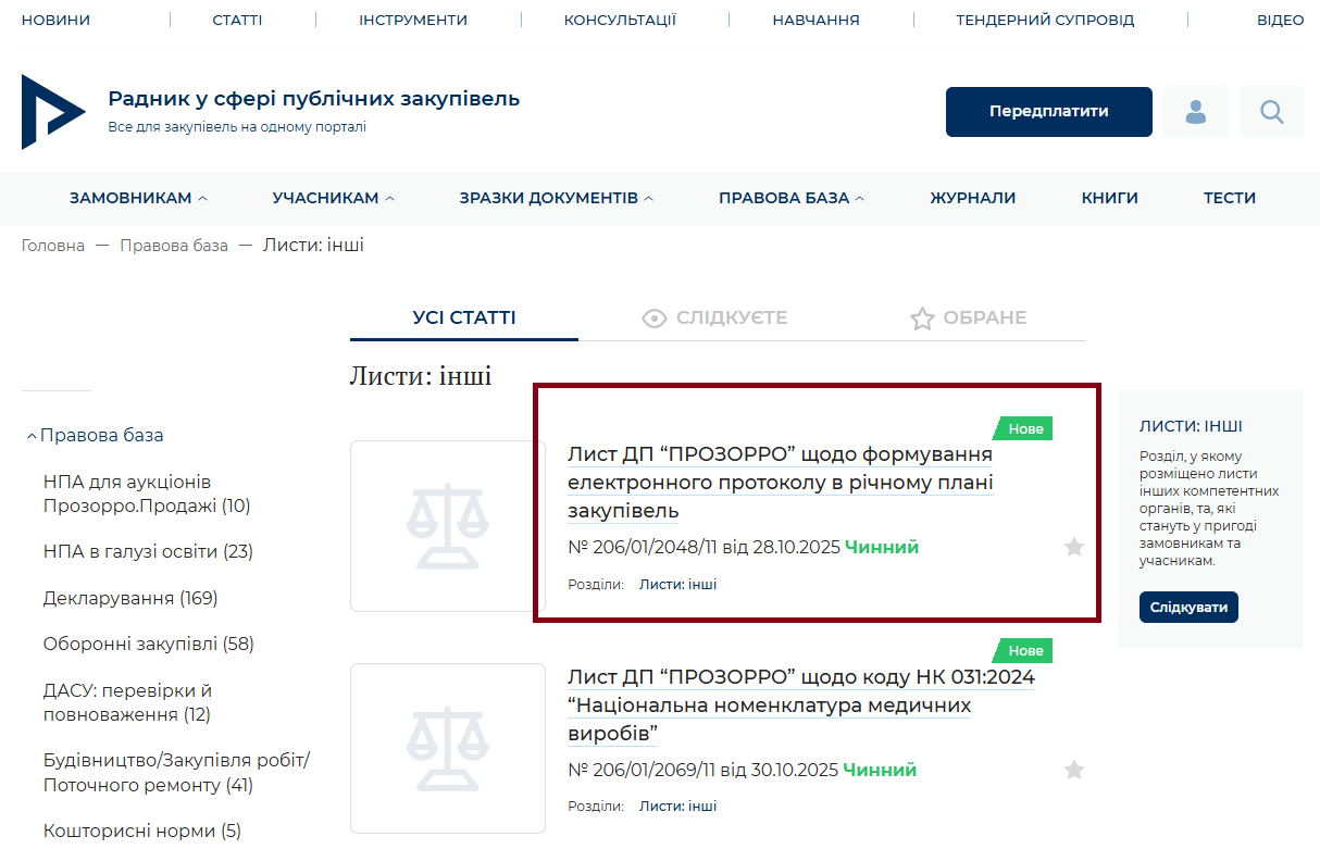 Вітаємо! Інформуємо, що на портал додано лист ДП “ПРОЗОРРО” щодо формування електронного протоколу в річному плані закупівель (розділ Листи: інші Правової бази):