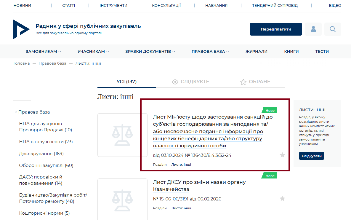 Вітаємо! Інформуємо, що на портал додано лист Мін’юсту щодо застосування санкцій до суб’єктів господарювання за неподання та/або несвоєчасне подання інформації про кінцевих бенефіціарних та/або структуру власності юридичної особи (розділ Листи: інші Правової бази):