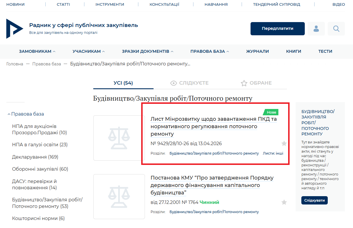 Вітаємо! Повідомляємо, що на портал додано лист Мінрозвитку щодо завантаження ПКД та нормативного регулювання поточного ремонт (розділи Будівництво/Закупівля робіт/Поточного ремонту та Листи: інші Правової бази):