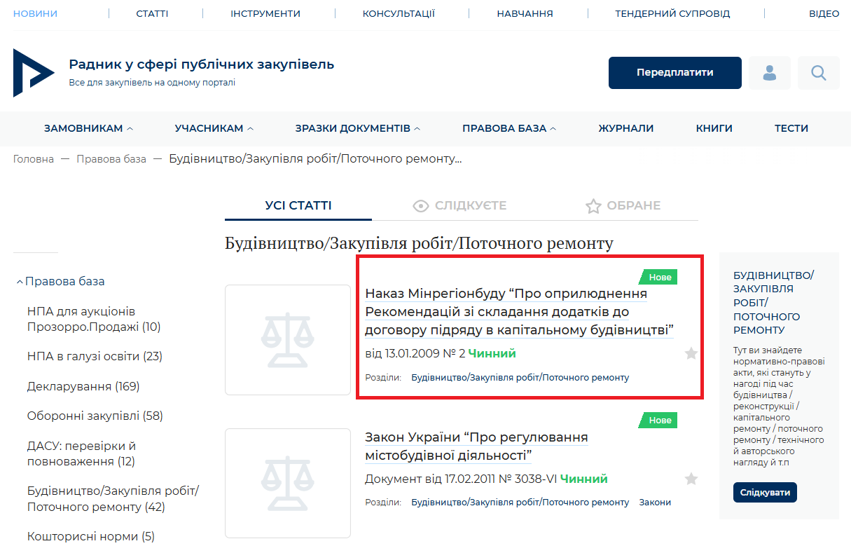 Вітаємо! Інформуємо, що на портал додано наказ Менрегіонбуду “Про оприлюднення Рекомендацій зі складання додатків до договору підряду в капітальному будівництві” (розділ Будівництво/Закупівля робіт/Поточного ремонту):
