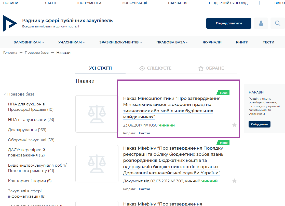 Вітаємо! Повідомляємо, що на портал додано наказ Мінсоцполітики “Про затвердження Мінімальних вимог з охорони праці на тимчасових або мобільних будівельних майданчиках” (розділ Накази Правової бази):