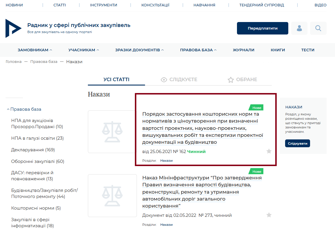 Вітаємо! Інформуємо, що на портал додано Порядок застосування кошторисних норм та нормативів з ціноутворення при визначенні вартості проектних, науково-проектних, вишукувальних робіт та експертизи проектної документації на будівництво (розділ Накази Правової бази):