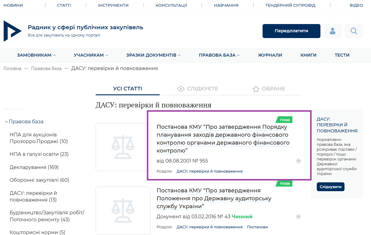 Вітаємо! Інформуємо, що на портал додано постанову КМУ “Про затвердження Порядку планування заходів державного фінансового контролю органами державного фінансового контролю” (розділ ДАСУ: перевірки й повноваження Правової бази):