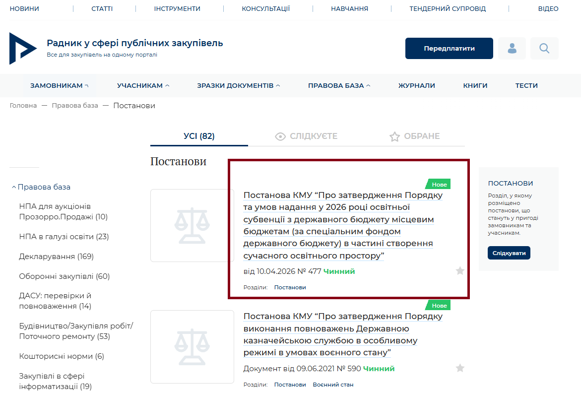Вітаємо! Повідомляємо, що на портал додано постанову КМУ “Про затвердження Порядку та умов надання у 2026 році освітньої субвенції з державного бюджету місцевим бюджетам (за спеціальним фондом державного бюджету) в частині створення сучасного освітнього простору”. Знайти її можна в розділі Постанови Правової бази: