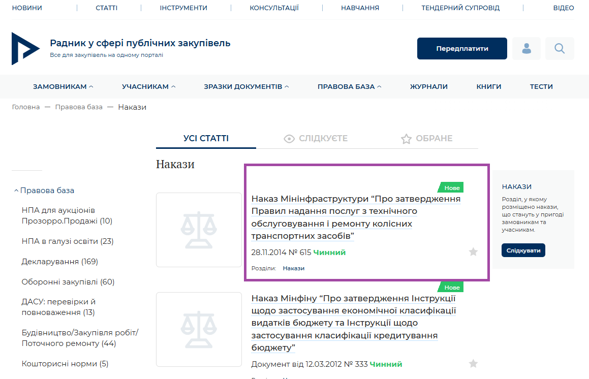Вітаємо! Інформуємо. що на портал додано наказ Мінінфраструктури “Про затвердження Правил надання послуг з технічного обслуговування і ремонту колісних транспортних засобів” (розділ Накази Правової бази):