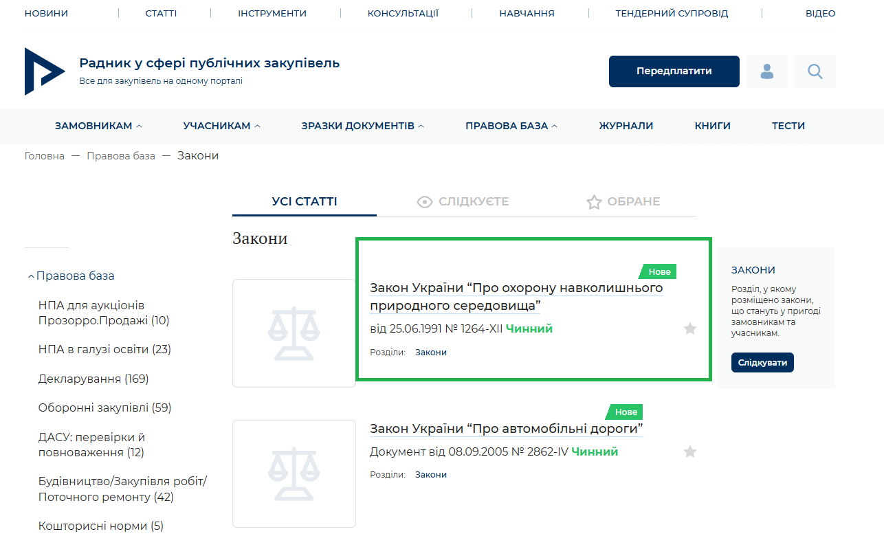 Вітаємо! Інформуємо, що на портал додано Закон України “Про охорону навколишнього природного середовища” (розділ Закони Правової бази):