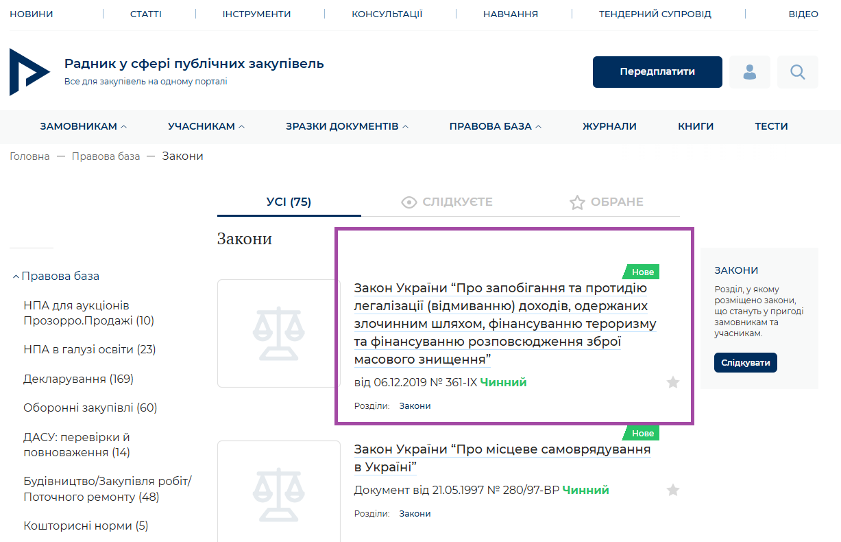 Вітаємо! Ініормуємо, що на портал додано Закон України “Про запобігання та протидію легалізації (відмиванню) доходів, одержаних злочинним шляхом, фінансуванню тероризму та фінансуванню розповсюдження зброї масового знищення” (розділ Закони Правової бази):