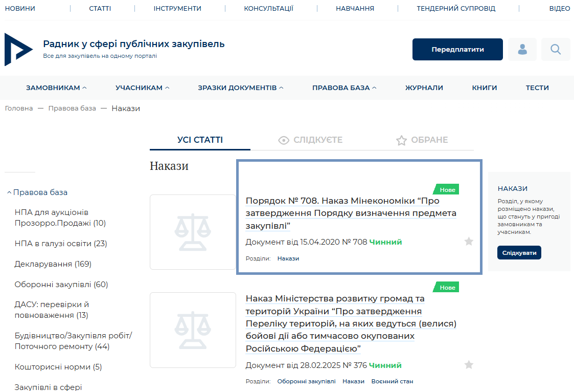 Вітаємо! Інформуємо, що на порталі актуалізовано наказ Мінекономіки “Про затвердження Порядку визначення предмета закупівлі” (розділ Накази Правової бази):
