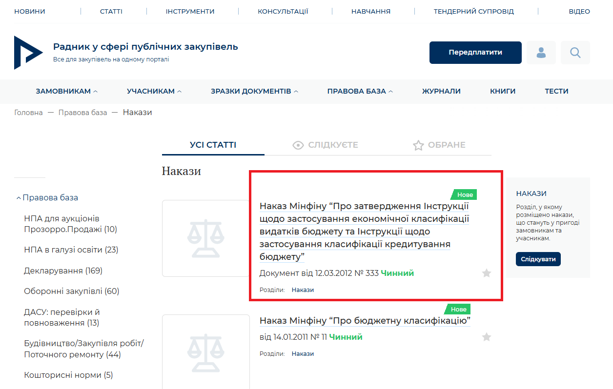 Вітаємо! Інформуємо, що на порталі оновлено наказ Мінфіну “Про затвердження Інструкції щодо застосування економічної класифікації видатків бюджету та Інструкції щодо застосування класифікації кредитування бюджету” (розділ Накази Правової бази):