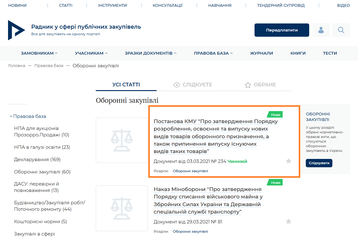 Вітаємо! Інформуємо, що на порталі оновлено постанову КМУ “Про затвердження Порядку розроблення, освоєння та випуску нових видів товарів оборонного призначення, а також припинення випуску існуючих видів таких товарів” (розділ Оборонні закупівлі):