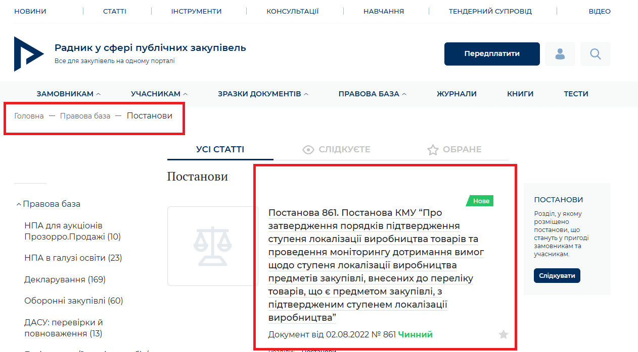 Вітаємо! Інформуємо, що у Правовій базі порталу оновлено постанову КМУ від 02.08.2022 № 861 “Про затвердження порядків підтвердження ступеня локалізації виробництва товарів та проведення моніторингу дотримання вимог щодо ступеня локалізації виробництва предметів закупівлі, внесених до переліку товарів, що є предметом закупівлі, з підтвердженим ступенем локалізації виробництва” (розділ Постанови):