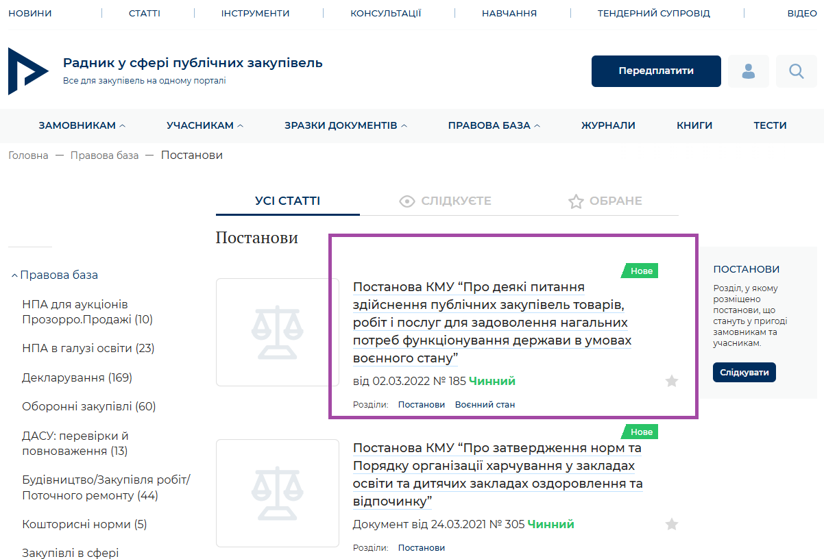 Вітаємо! На порталі оновлено постанову КМУ “Про деякі питання здійснення публічних закупівель товарів, робіт і послуг для задоволення нагальних потреб функціонування держави в умовах воєнного стану” (розділ Постанови):