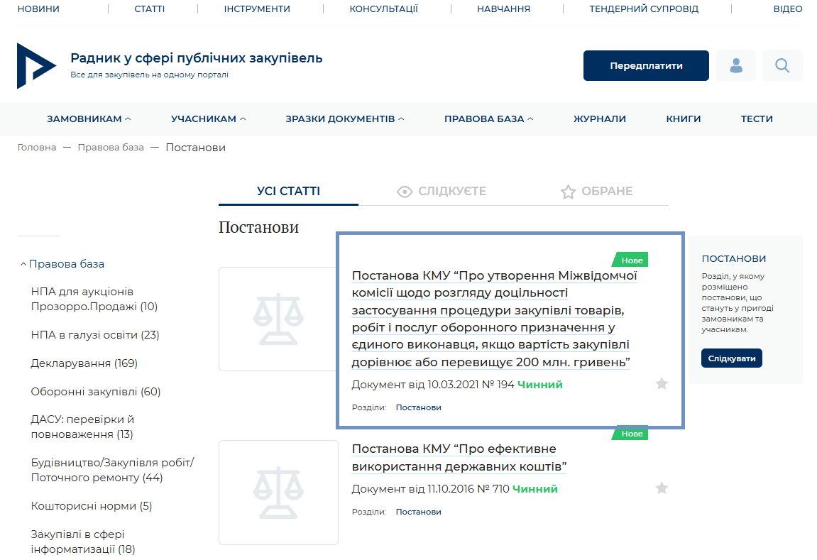 Вітаємо! Інформуємо, що на порталі оновлено постанову КМУ “Про утворення Міжвідомчої комісії щодо розгляду доцільності застосування процедури закупівлі товарів, робіт і послуг оборонного призначення у єдиного виконавця, якщо вартість закупівлі дорівнює або перевищує 200 млн гривень” (розділ Постанови Правової бази):