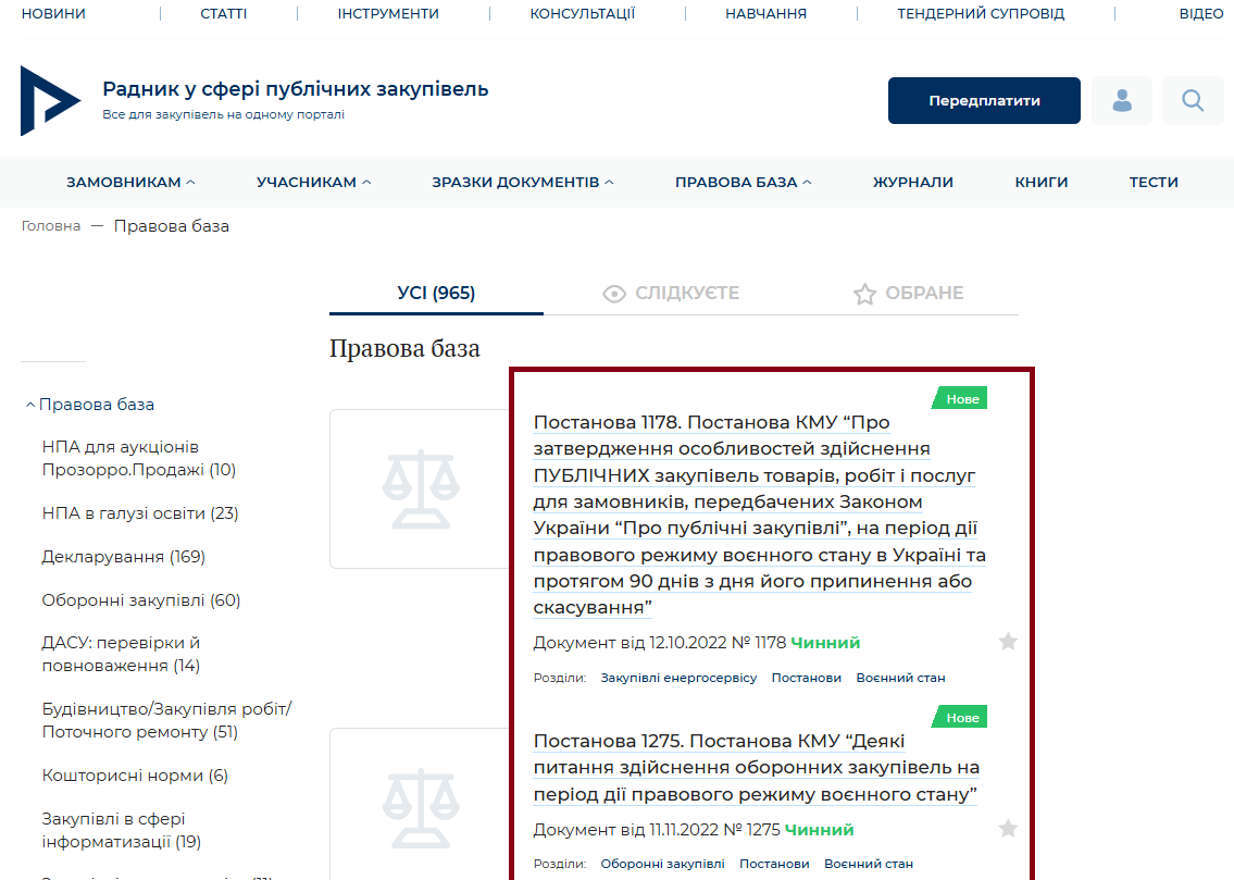 Вітаємо! Інформуємо, що у Правовій базі порталу оновлено: