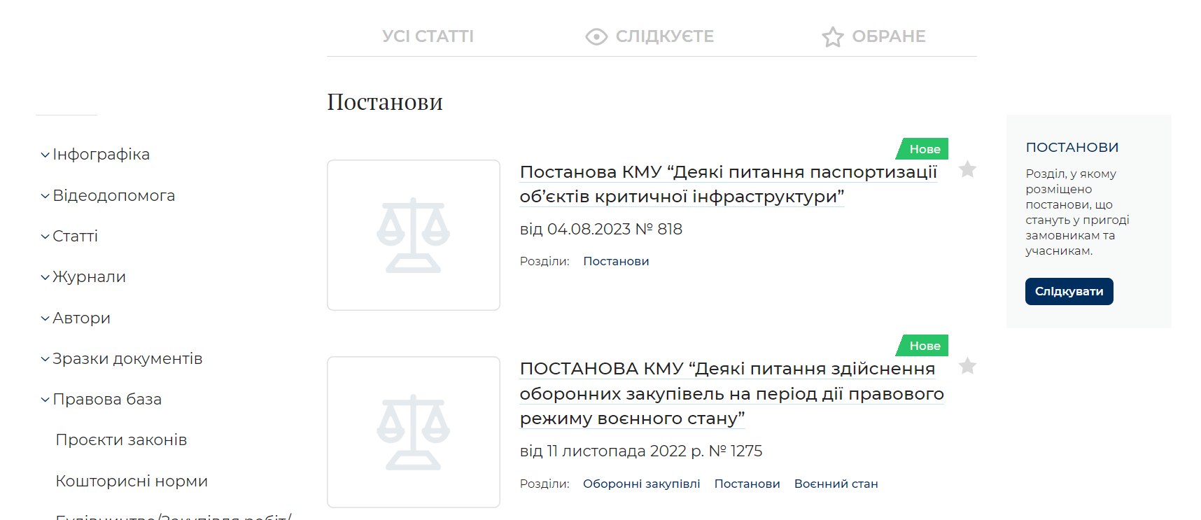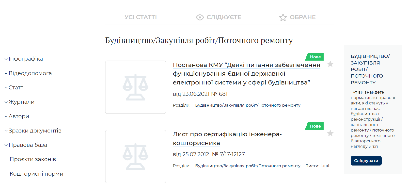 - у розділ Будівництво/Закупівля робіт/Поточного ремонту – Постанова КМУ “Деякі питання забезпечення функціонування Єдиної державної електронної системи у сфері будівництва”.