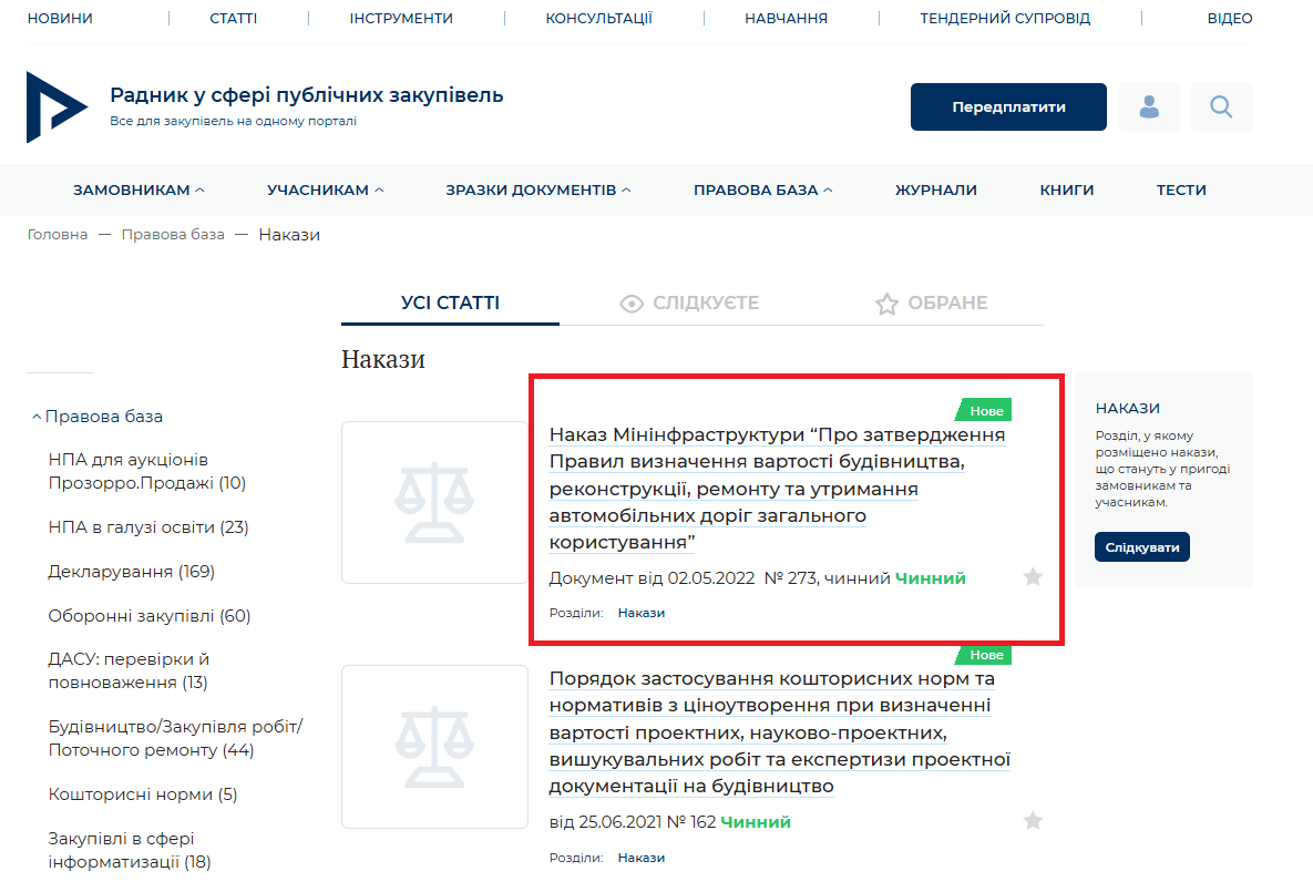 Вітаємо! Інформуємо, що на порталі оновлено наказ Мінінфраструктури “Про затвердження Правил визначення вартості будівництва, реконструкції, ремонту та утримання автомобільних доріг загального користування” (розділ Накази Правової бази):