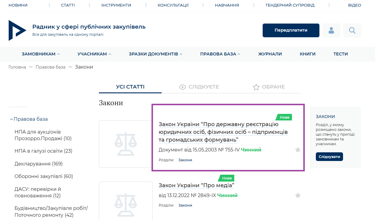 На порталі оновлено закон України “Про державну реєстрацію юридичних осіб, фізичних осіб – підприємців та громадських формувань”