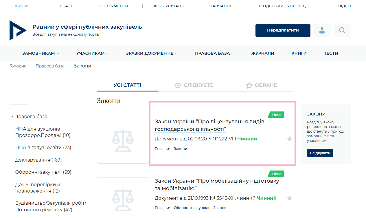 Вітаємо! Інформуємо, що на порталі оновлено Закон України “Про ліцензування видів господарської діяльності” (розділ Закони Правової бази):