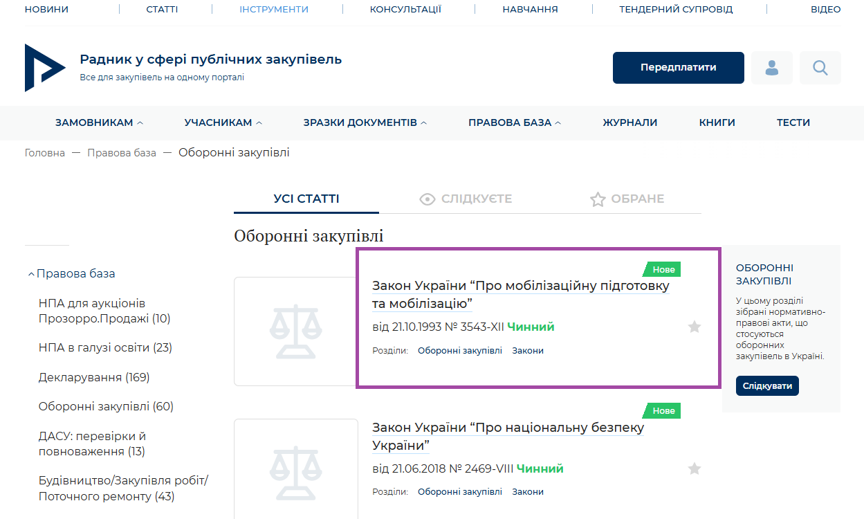 Вітаємо! Повідомляємо, що на порталі оновлено Закон України “Про мобілізаційну підготовку та мобілізацію” (розділи Закони, Оборонні закупівлі Правової бази):