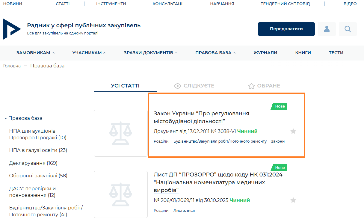 Вітаємо! Повідомляємо, що на порталі оновлено Закон України “Про регулювання містобудівної діяльності”. Знайти його можна в розділах Закони та Будівництво/Закупівля робіт/Поточного ремонту: