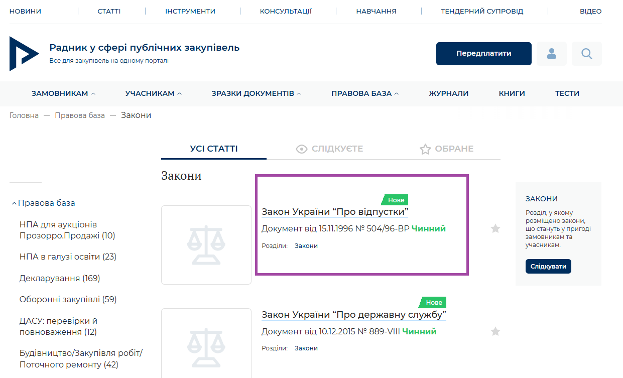 Вітаємо! Повідомляємо, що на порталі оновлено Закон України “Про відпустки” (розділ Закони Правової бази порталу):