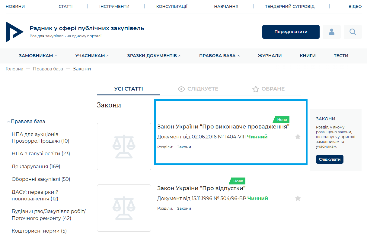Вітаємо! Повідомляємо, що на порталі оновлено Закон України “Про виконавче провадження” (розділ Закони Правової бази):