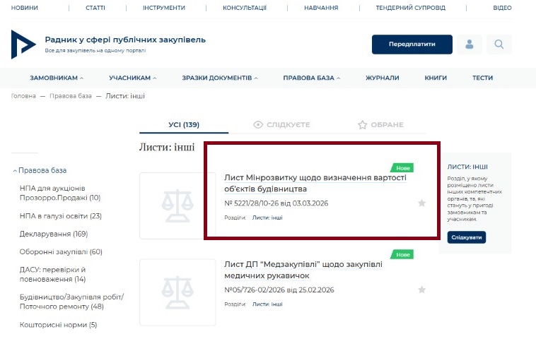 Вітаю! Інформуємо, що на порталі оприлюднено лист Мінрозвитку щодо визначення вартості об’єктів будівництва (розділ Листи: інші Правової бази):