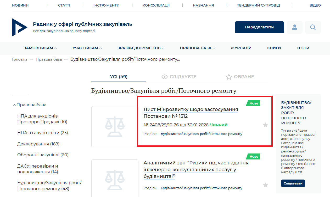 Вітаємо! Інформуємо, що на порталі оприлюднено лист Мінрозвитку щодо застосування Постанови № 1512 (розділ Будівництво/Закупівля робіт/Поточного ремонту):