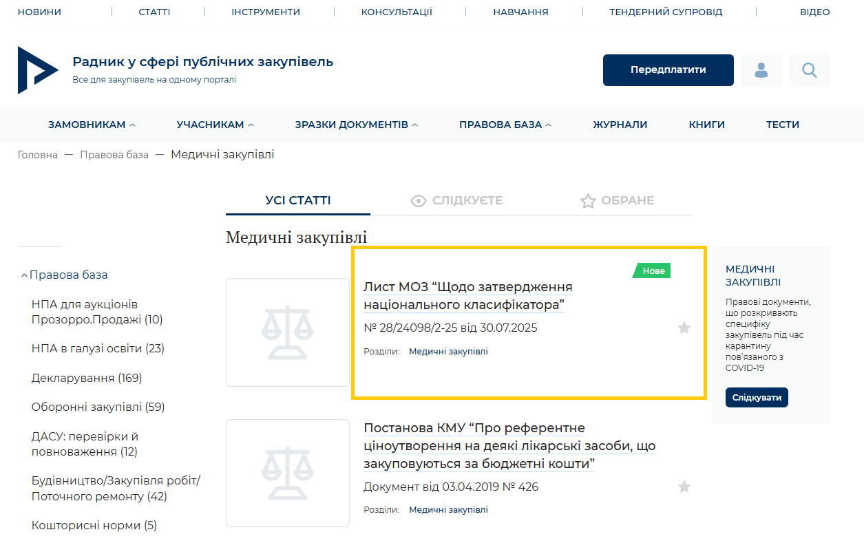 Вітаємо! Інформуємо, що на портал додано лист МОЗ “Щодо затвердження національного класифікатора” (розділ Медичні закупівлі Правової бази):