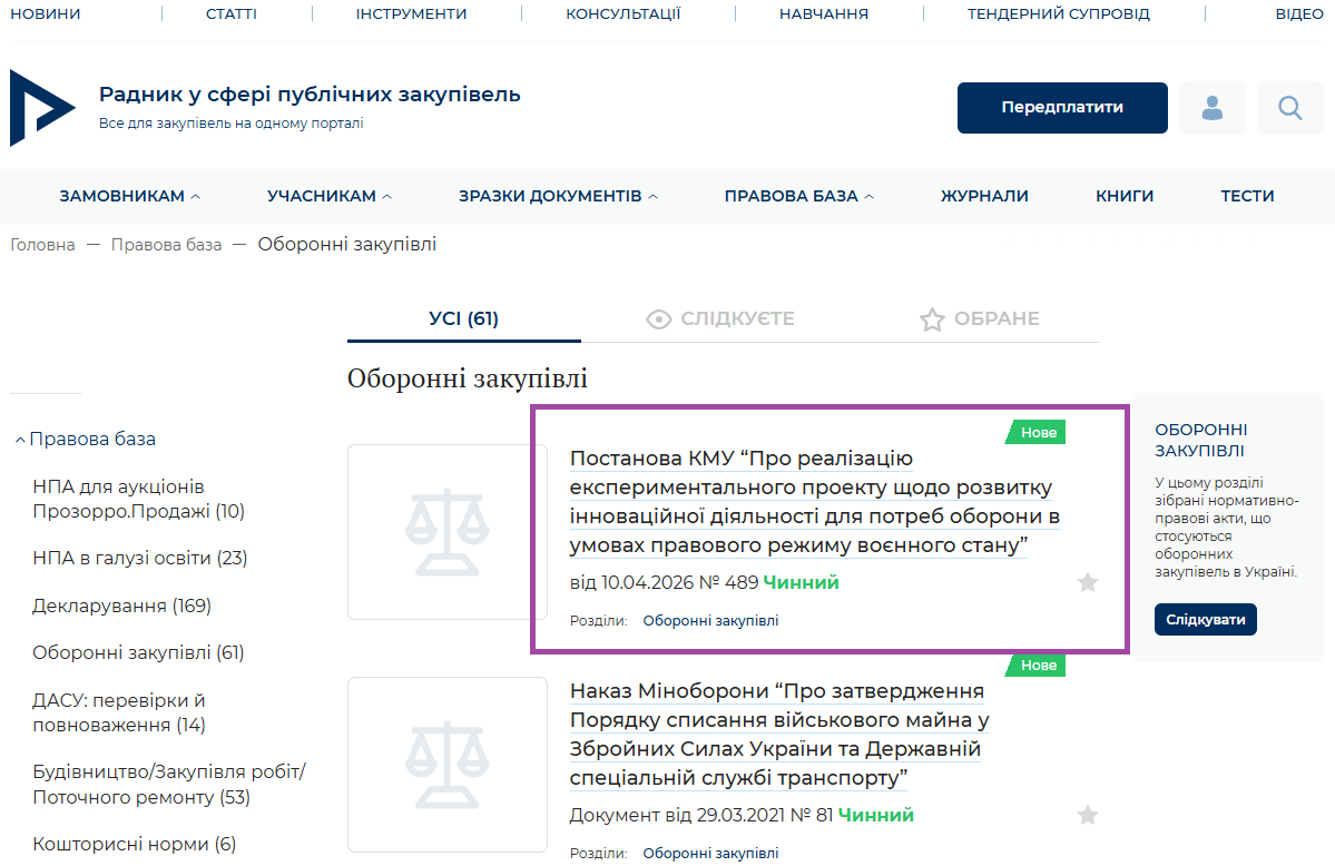 Вітаємо! Інформуємо, що на порталі оприлюднено постанову КМУ “Про реалізацію експериментального проекту щодо розвитку інноваційної діяльності для потреб оборони в умовах правового режиму воєнного стану” (розділ Оборонні закупівлі Правової бази):