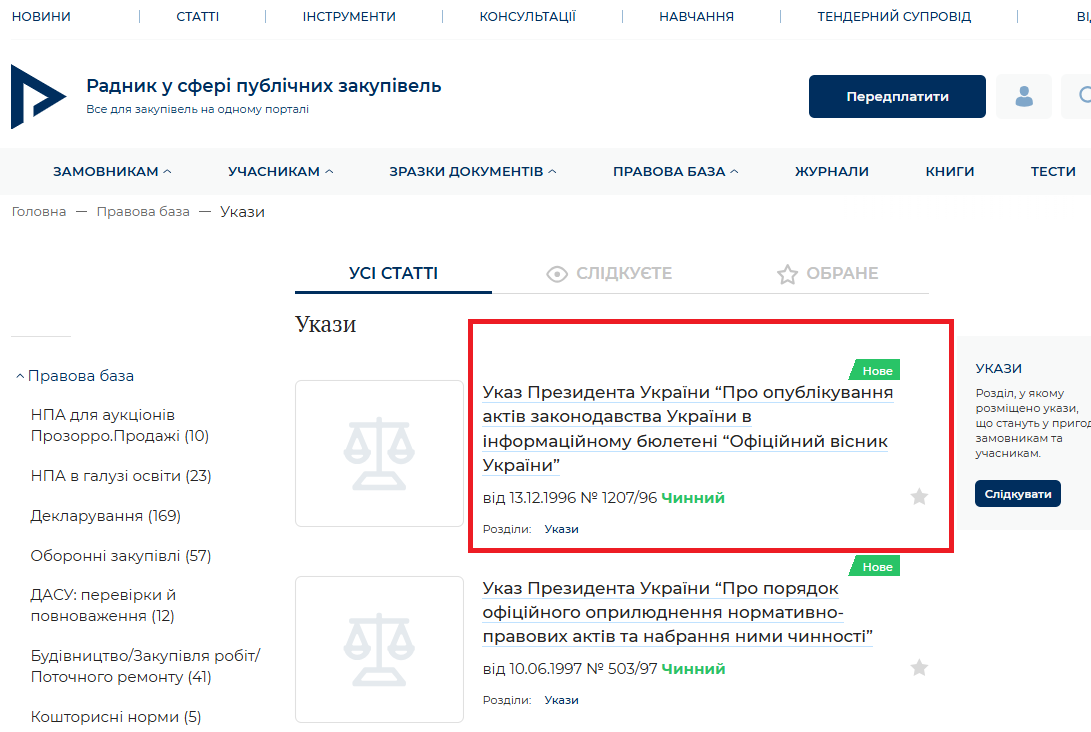 Вітаємо! Повідомляємо, що на порталі оприлюднено Указ Президента України “Про опублікування актів законодавства України в інформаційному бюлетені “Офіційний вісник України” (розділ Укази Правової бази):
