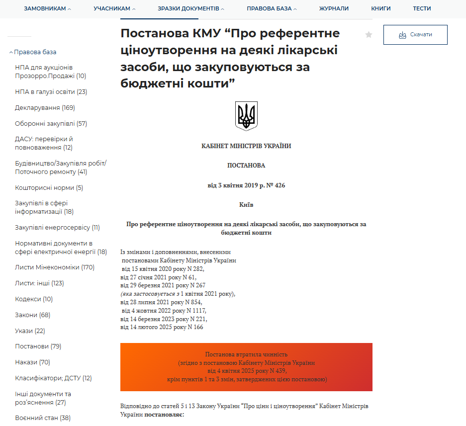 Вітаємо! Інформуємо, що згідно з постановою КМУ від 4 квітня 2025 року № 439, постанова КМУ “Про референтне ціноутворення на деякі лікарські засоби, що закуповуються за бюджетні кошти” втратила чинність, крім пунктів 1 та 3 змін, затверджених цією постановою: