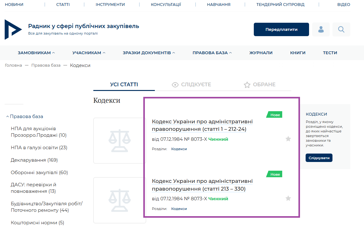 Вітаємо! Повідомляємо, що у Правовій базі оновлено Кодекс України про адміністративні правопорушення (розділ Кодеси):