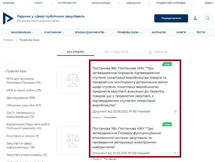 - Постанову КМУ “Про затвердження порядків підтвердження ступеня локалізації виробництва товарів та проведення моніторингу дотримання вимог щодо ступеня локалізації виробництва предметів закупівлі, внесених до переліку товарів, що є предметом закупівлі, з підтвердженим ступенем локалізації виробництва”.