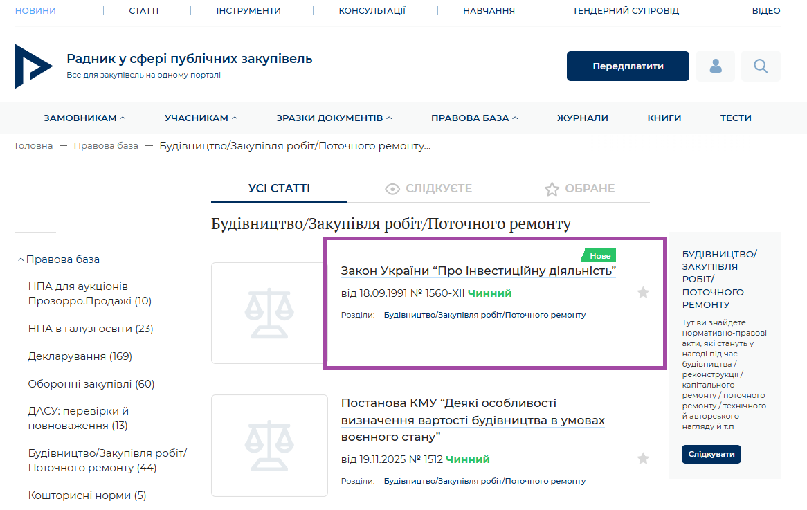 Вітаємо! Повідомляємо, що на порталі оприлюднено Закон України “Про інвестиційну діяльність” (розділ Будівництво/Закупівля робіт/Поточного ремонту):