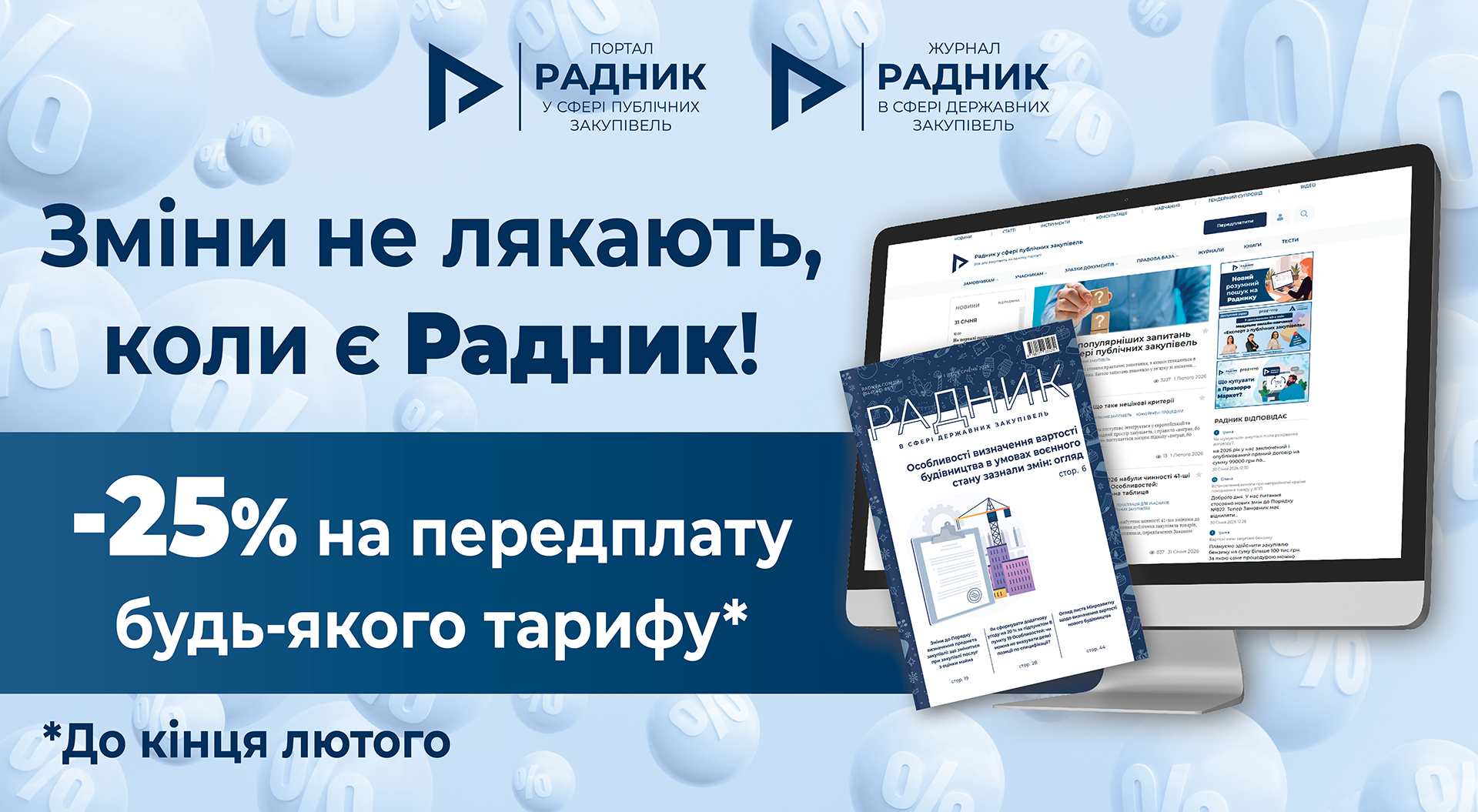 Щоб зробити доступ до актуальної інформації ще зручнішим, у лютому діє знижка -25 % на передплату порталу «Радник у сфері публічних закупівель». Передплатники отримують систематизовані матеріали, роз’яснення складних питань та практичні рекомендації з урахуванням останніх змін законодавства.