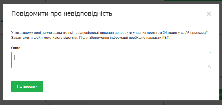Для того щоб надати учаснику 24 години для усунення невідповідностей, замовнику необхідно заповнити поле «Опис» та натиснути «Підтвердити».