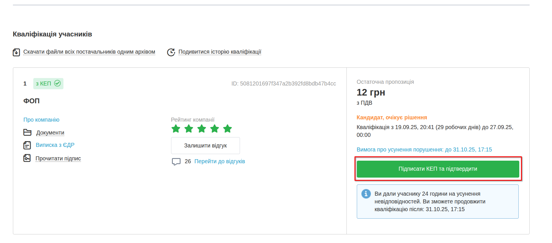 Після того як замовник підтвердить дію КЕПом, йому стануть доступні звичні кнопки для подальших дій у процесі кваліфікації учасника.
