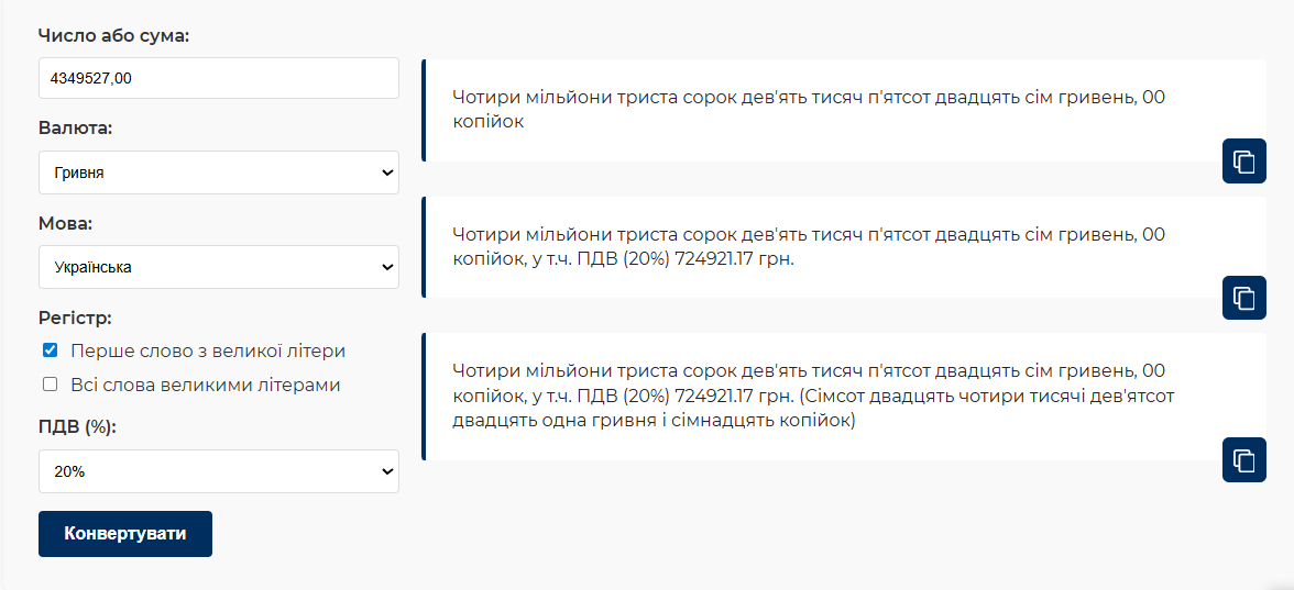 Як це працює? Уявімо, що ви укладаєте договір на 4 349 527,00 грн. Просто наберіть цю суму у вікні «Число або сума», виберіть валюту, мову, регістр та ставку ПДВ і натисніть «Конвертувати». Миттєво отримаєте результат, який можна скопіювати і вставити у ваші документи.