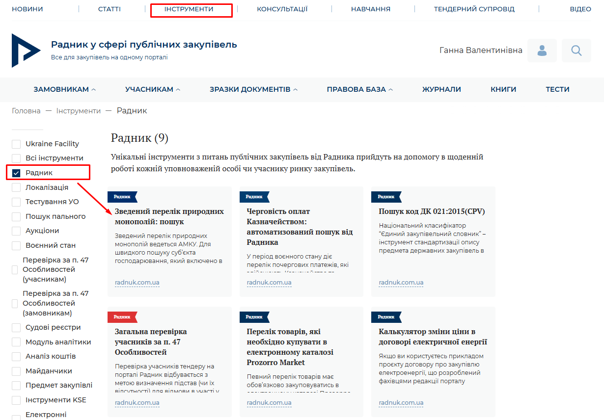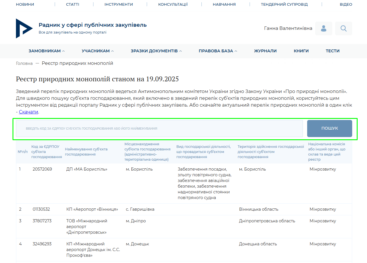 Інструмент «Реєстр природних монополій» розміщений в підрозділі «Радник»:
