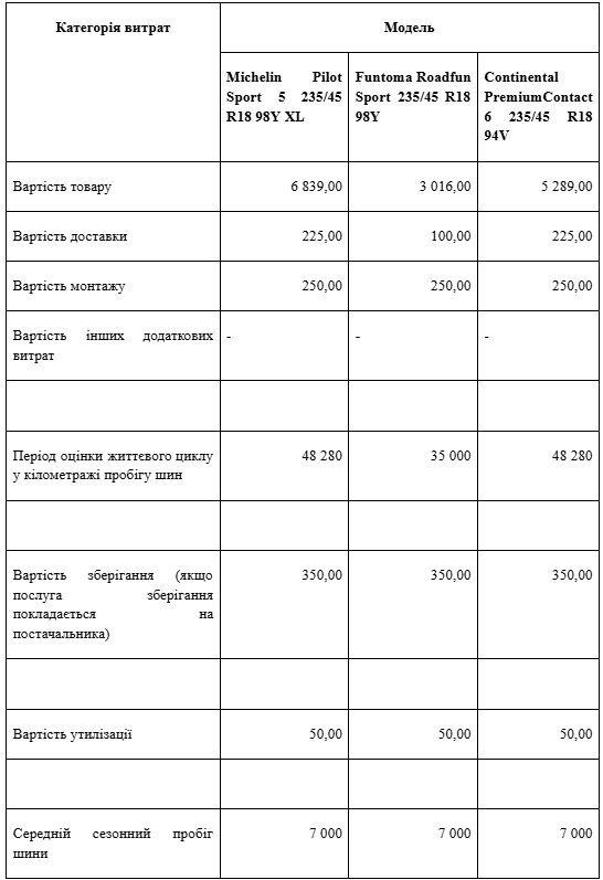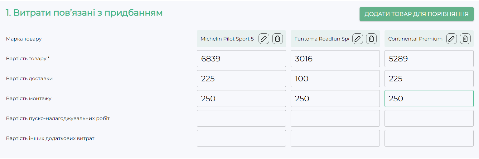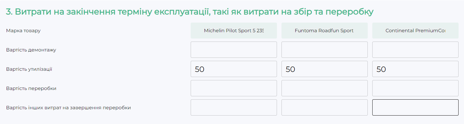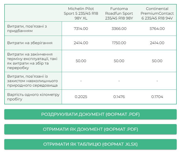 Калькулятор вартості життєвого циклу доступний за цим посиланням. Для демонстрації роботи Калькулятора вибрано три моделі літніх шин 235/45 R18. Після введення даних (вартість, пробіг, витрати на зберігання та утилізацію) Калькулятор визначив, що шини компанії Funtoma є найвигіднішими за сукупними витратами. Усі етапи — від введення даних до результату — проілюстровані у зображеннях (Рис. 1–5).