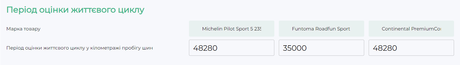 Наступним кроком зазначаємо період оцінки життєвого циклу в кілометражі пробігу шин, відповідно до інформації виробника, як це відображено на Рис. 2.