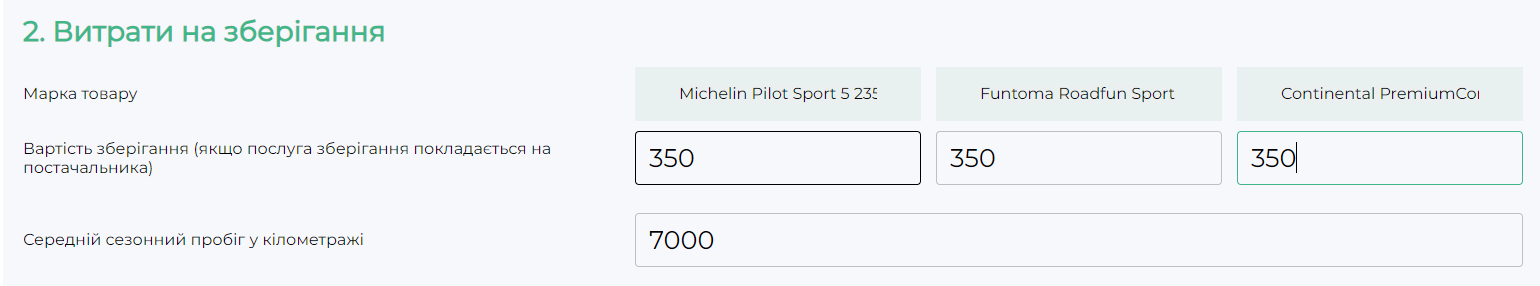 Тепер зазначаємо дані, які належать до витрат на зберігання, а саме: сезонний пробіг шин та безпосередньо вартість витрат. Зверніть увагу на зразок заповнення, який наведений на Рис. 3.