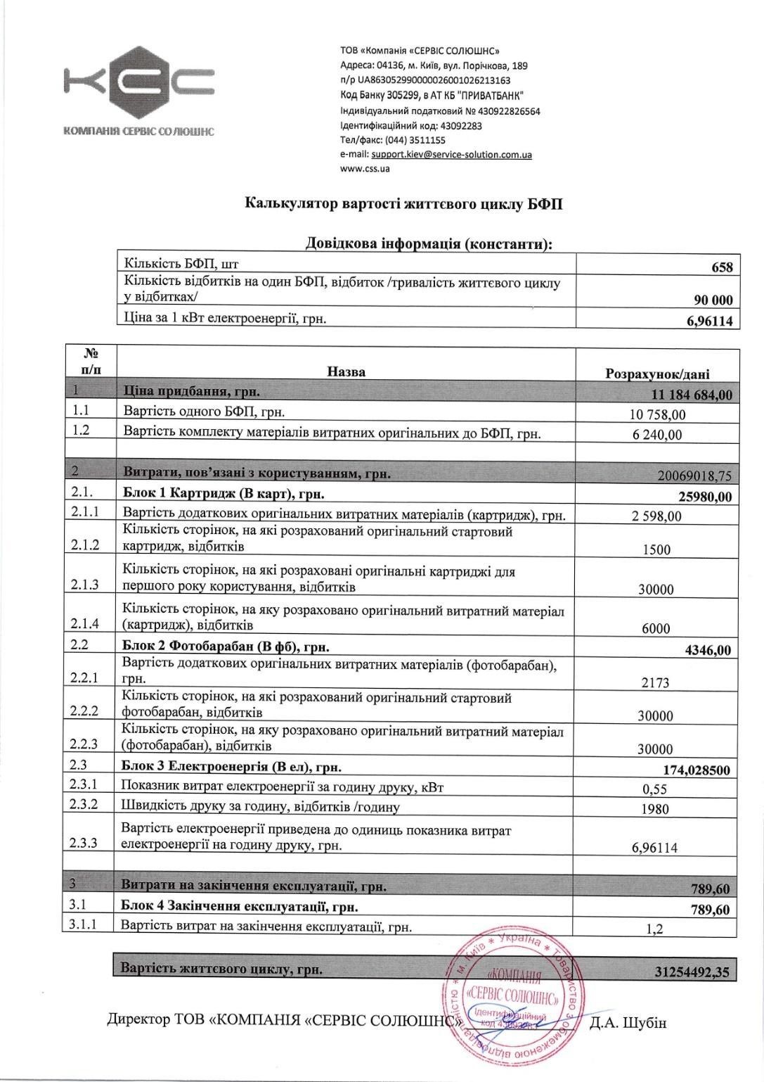 1.2 | Вартість комплекту матеріалів витратних оригінальних до БФП, грн | |