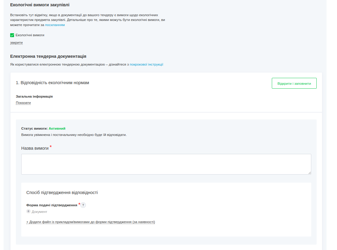 Якщо ви плануєте застосовувати екологічні вимоги в тендері, то тепер не зможете обмежитися лише прапорцем «Екологічні вимоги». Для оголошення закупівлі з такими вимогами необхідно буде в окремому полі зазначити назву вимоги й прикріпити файл з роз’ясненнями для постачальника (за потреби). Цей критерій не обов’язковий до використання, але деякі замовники ним активно користуються.