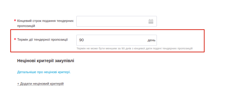 Це нове для замовників поле, яке необхідно заповнити в оголошенні. За замовчуванням у полі введено мінімальний термін 90 днів, але замовник може його редагувати відповідно до своїх вимог і норм законодавства.