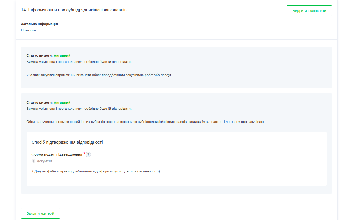 Постачальник під час подання тендерної пропозиції погоджується з цією вимогою та завантажує відповідні документи до пропозиції, якщо такі вимагалися замовником.