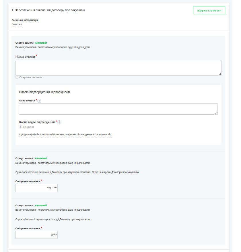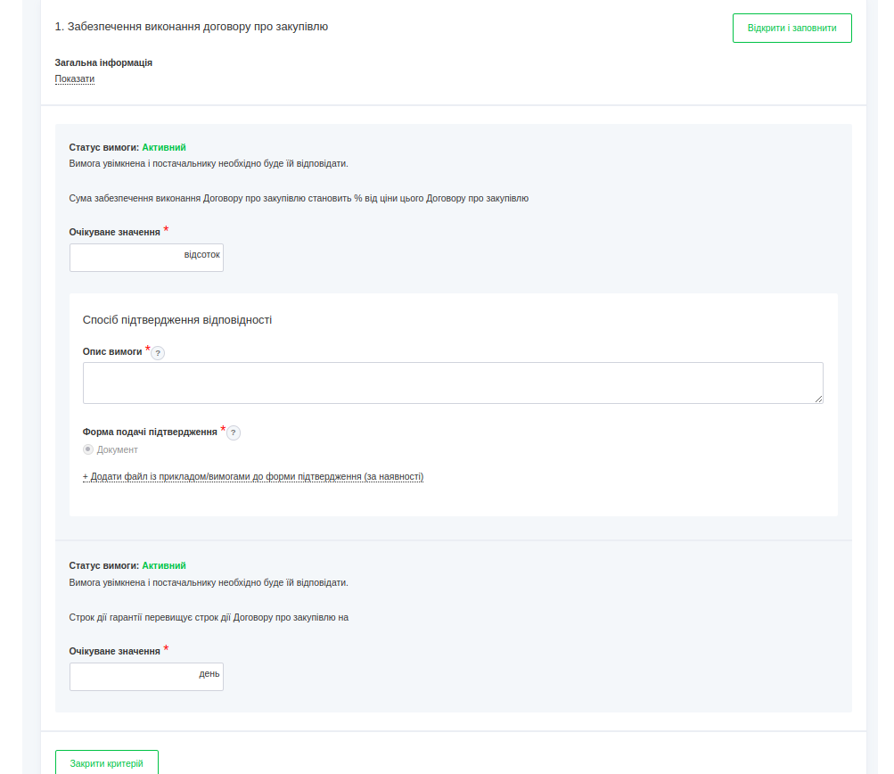 При цьому в разі вибору іншої форми забезпечення замовник повинен описати, що конкретно він вимагає (у полі «Назва вимоги»), та описати цю вимогу (у полі «Опис вимоги»), а також зазначити відсоток такого забезпечення та на скільки днів забезпечення перевищує термін дії договору (можна зазначити 0 днів).