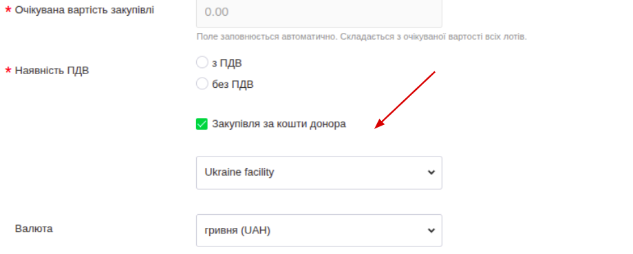 - для закупівель за кошти Ukraine Facility при оголошенні закупівлі ще додатково вказується донор;